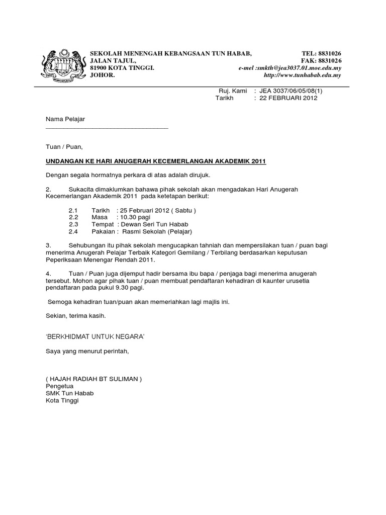 Surat makluman kepada ibu bapa pelajar. Contoh surat jemputan liputan media contoh surat jemputan. Contoh surat penerima anugerah hari kecemerlangan dan graduasi.